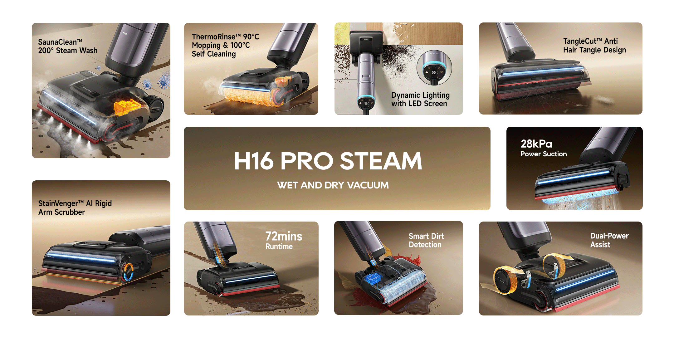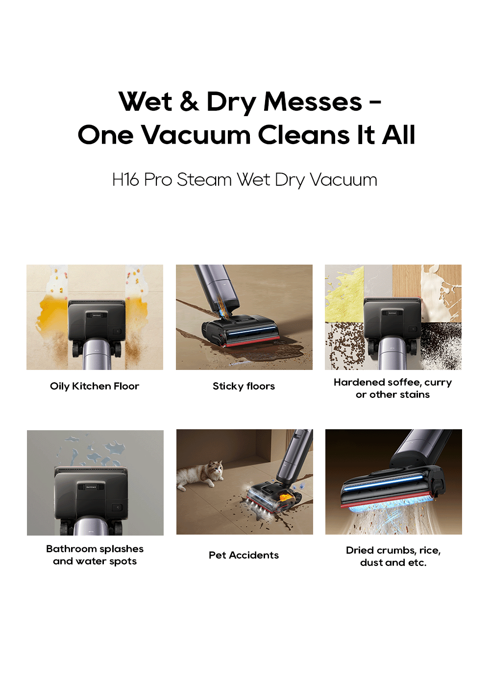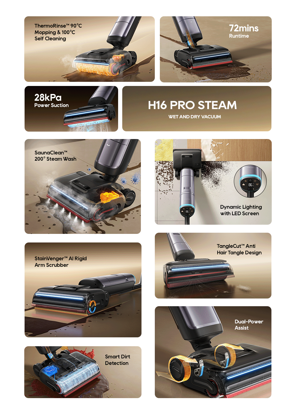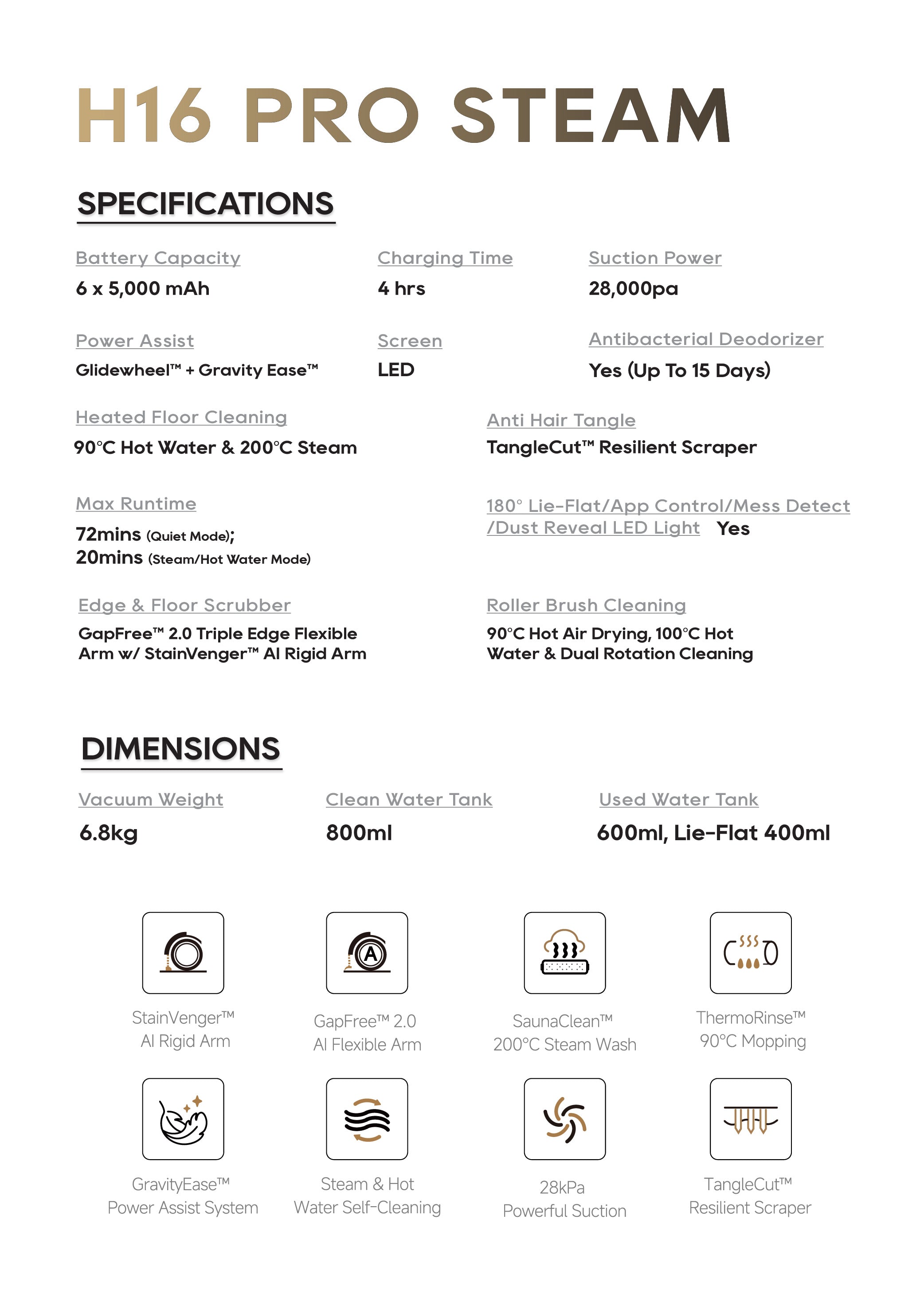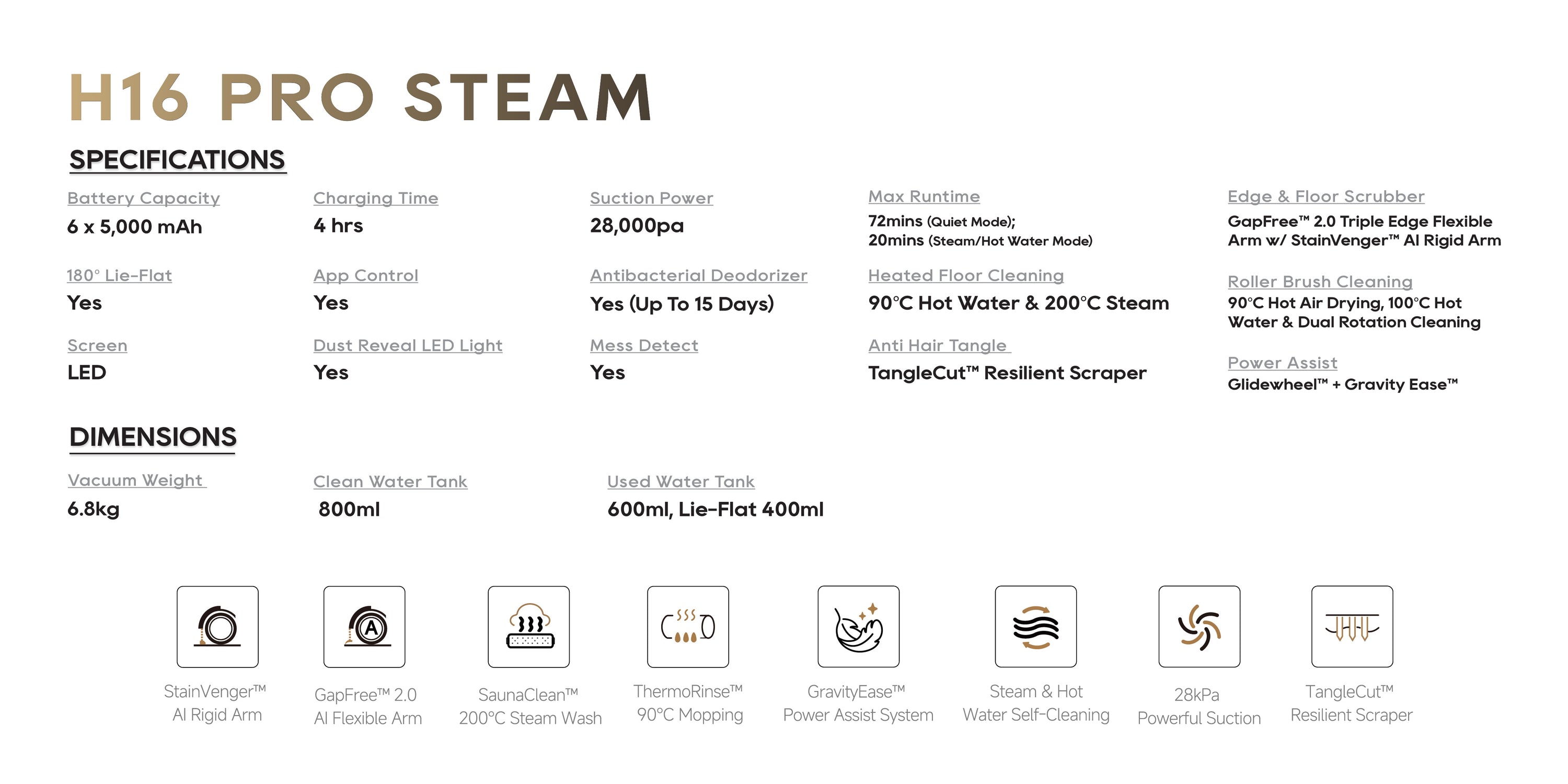 Reinnovate the cleaning game with it's 28,000Pa suction power, tackling messes efficiently on any hard surfaces. No messes is too tough for the NEW H16 Pro Steam.
