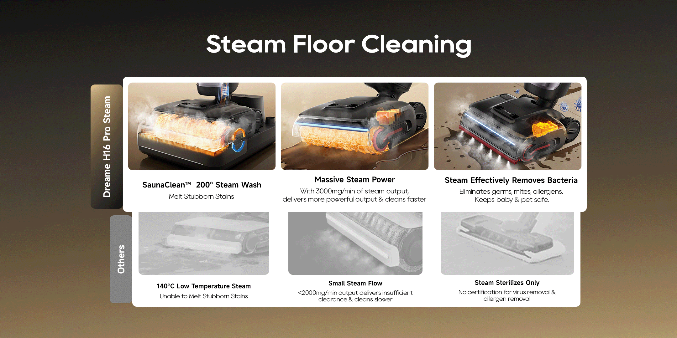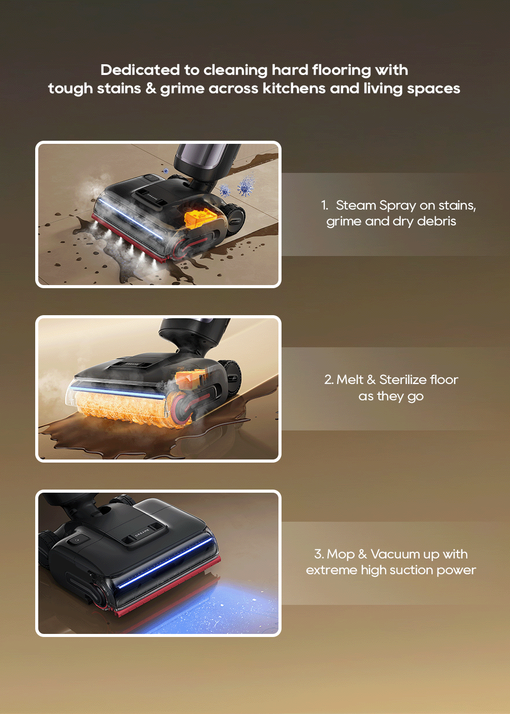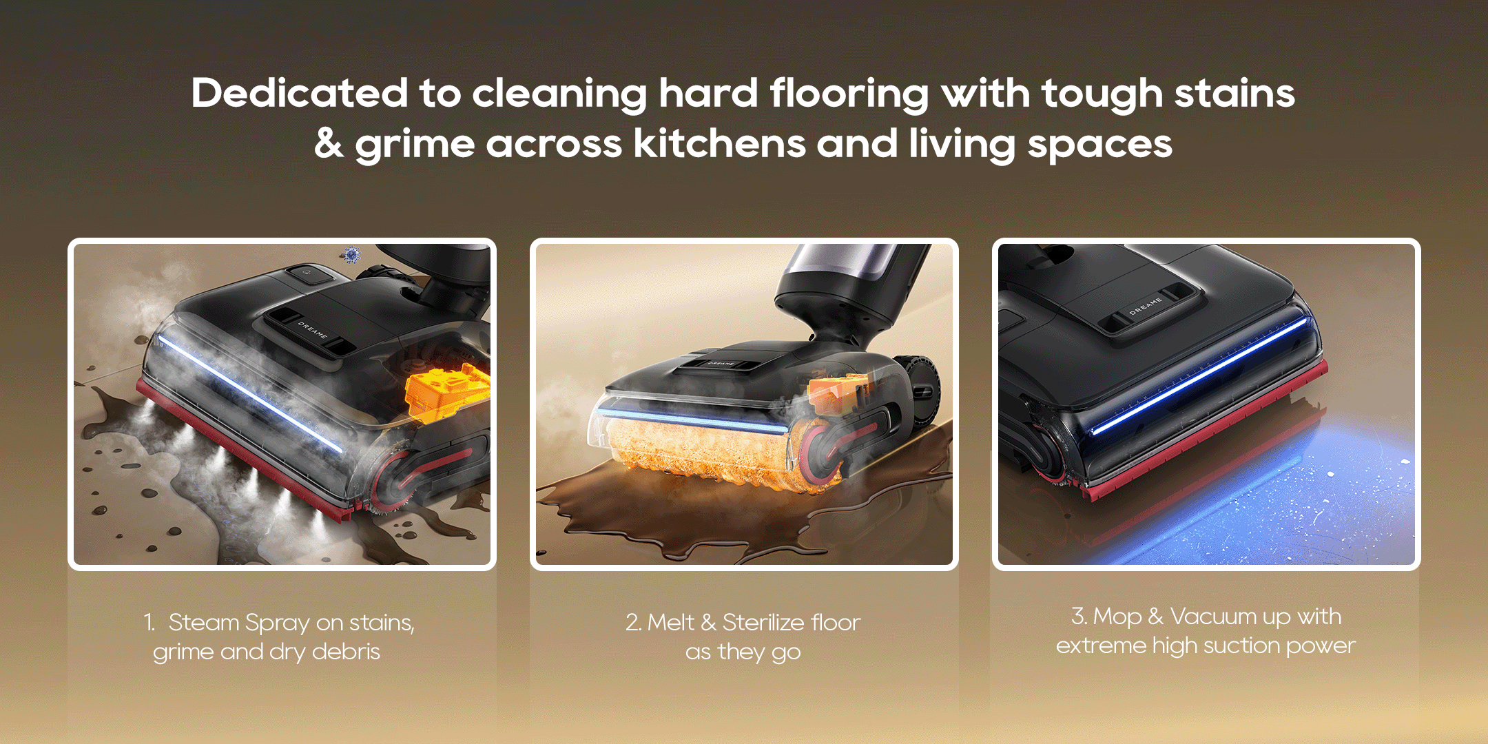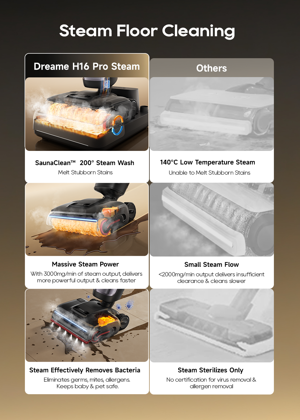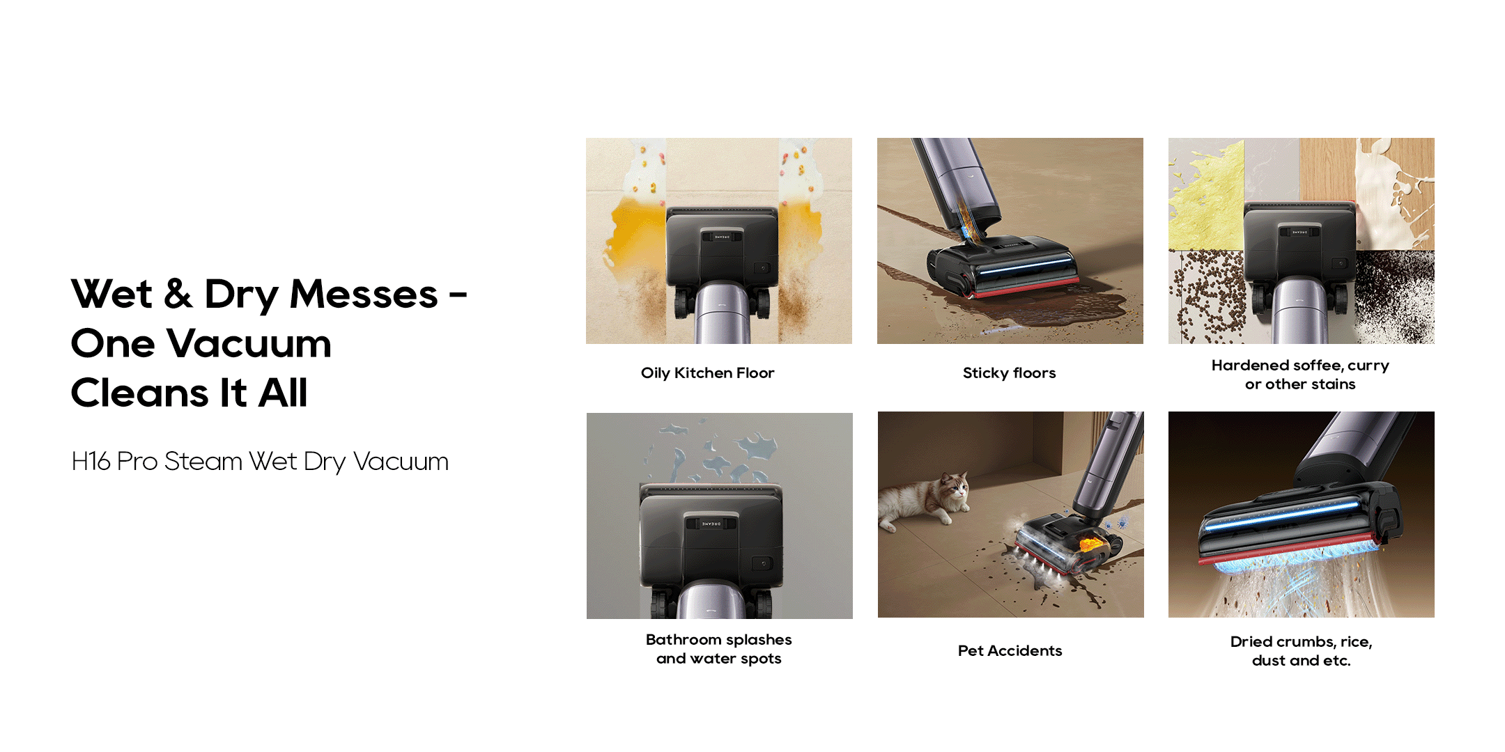 Reinnovate the cleaning game with it's 28,000Pa suction power, tackling messes efficiently on any hard surfaces. No messes is too tough for the NEW H16 Pro Steam.