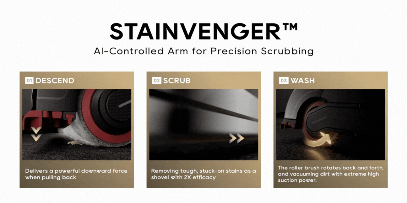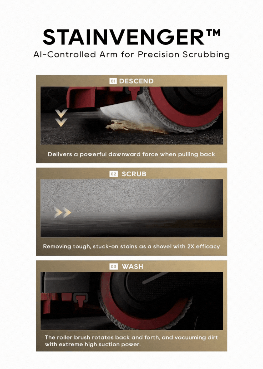Featuring StainVenger™ AI Rigid Arm and GapFree™ 2.0 Tri-Edge Flexible Arm for 100% tough stain removal and zero water stain at edges.