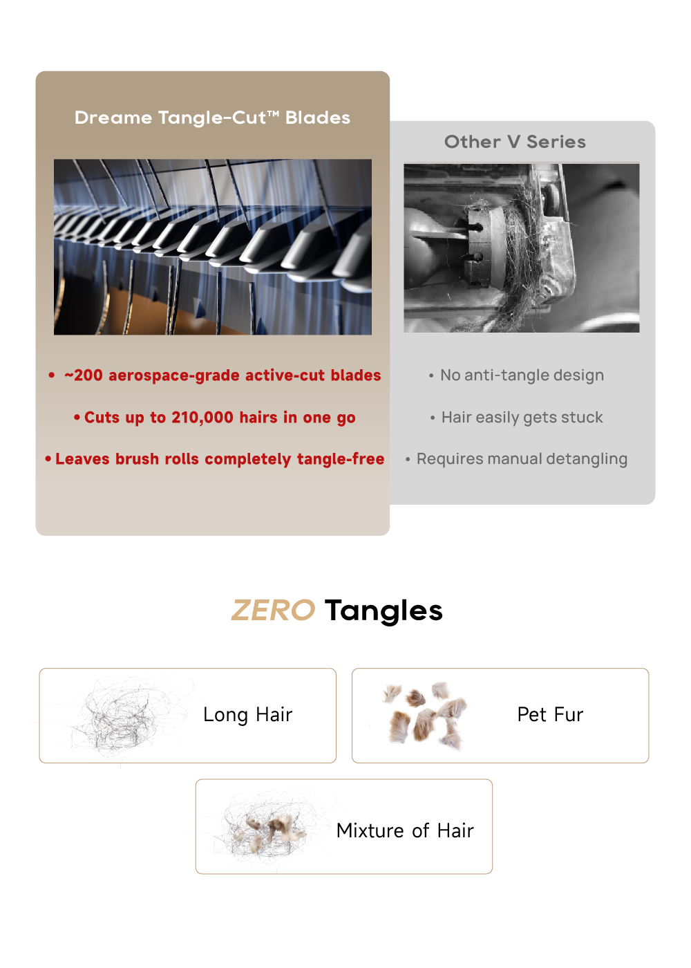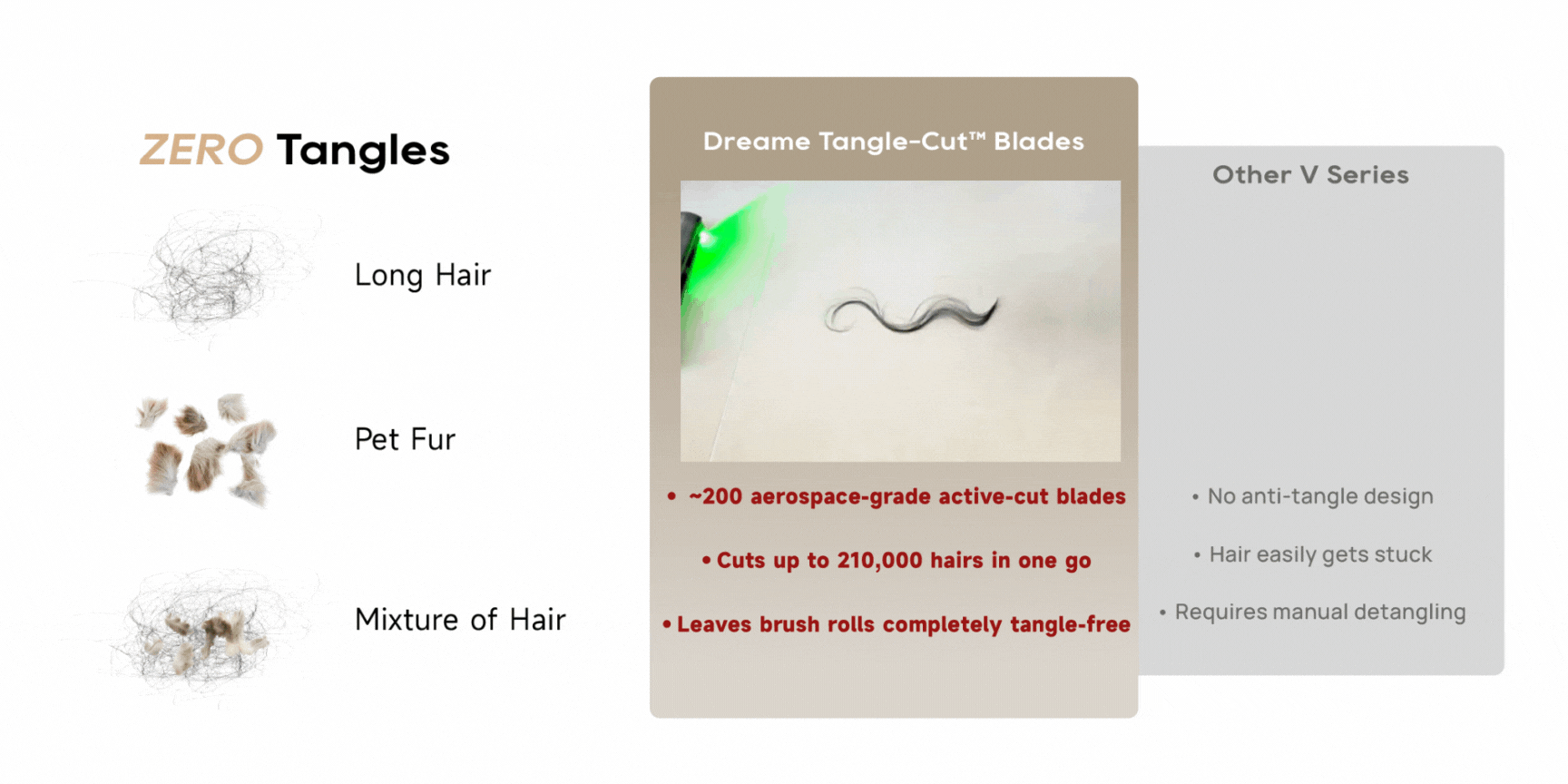 Cuts 210,000 hairs per run with tangle-free blades. No more manually removing hair from roller brush.