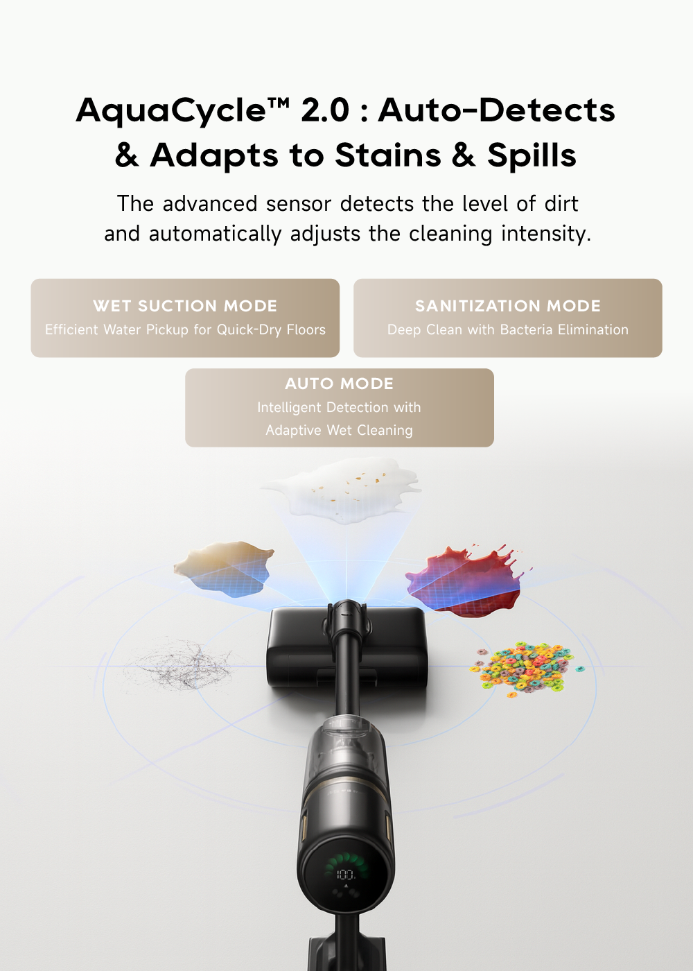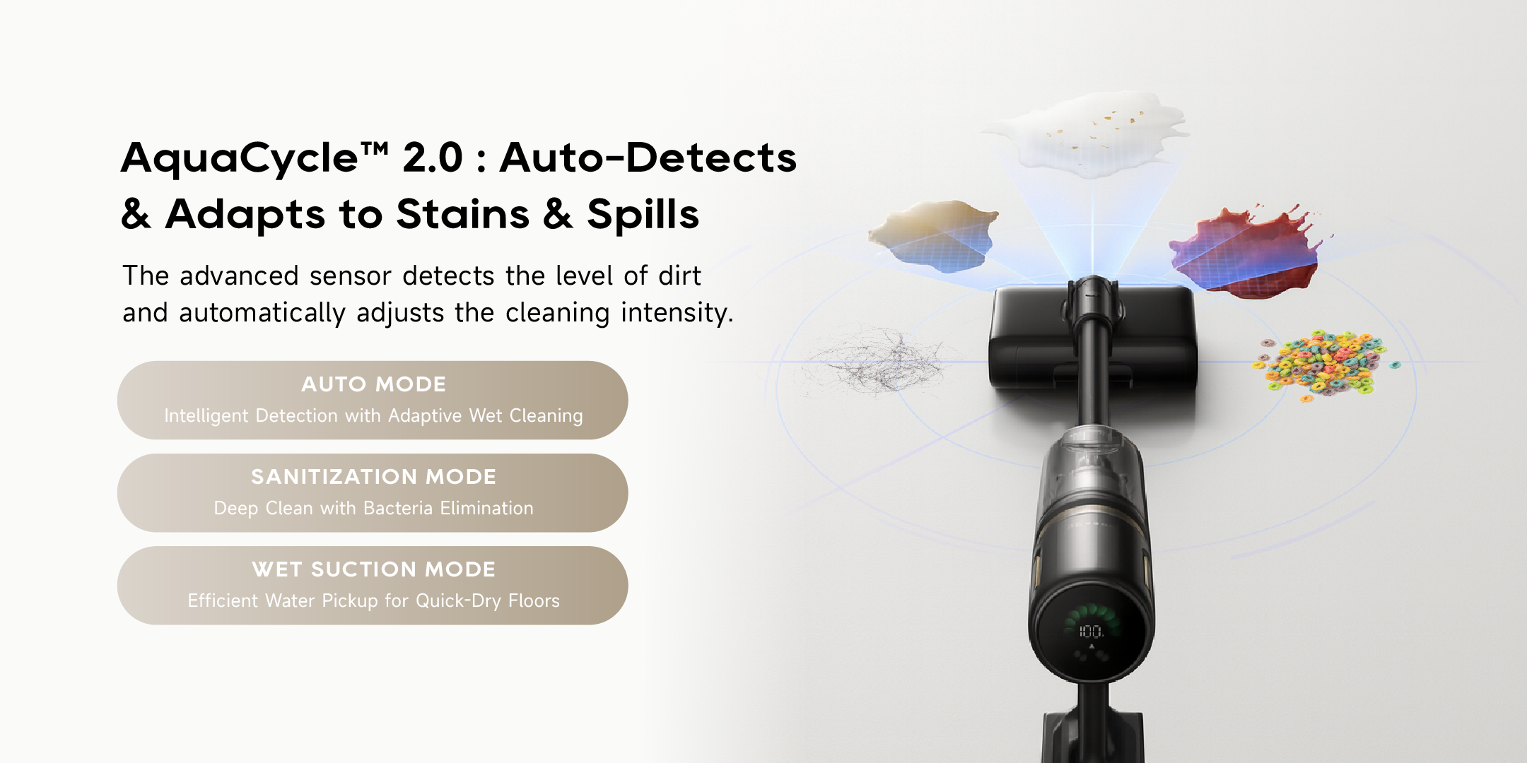 Picks up liquid and debris with strong suction power —no residue left behind. Also, it automatically generates electrolyzed water for deep sanitization as it cleans.