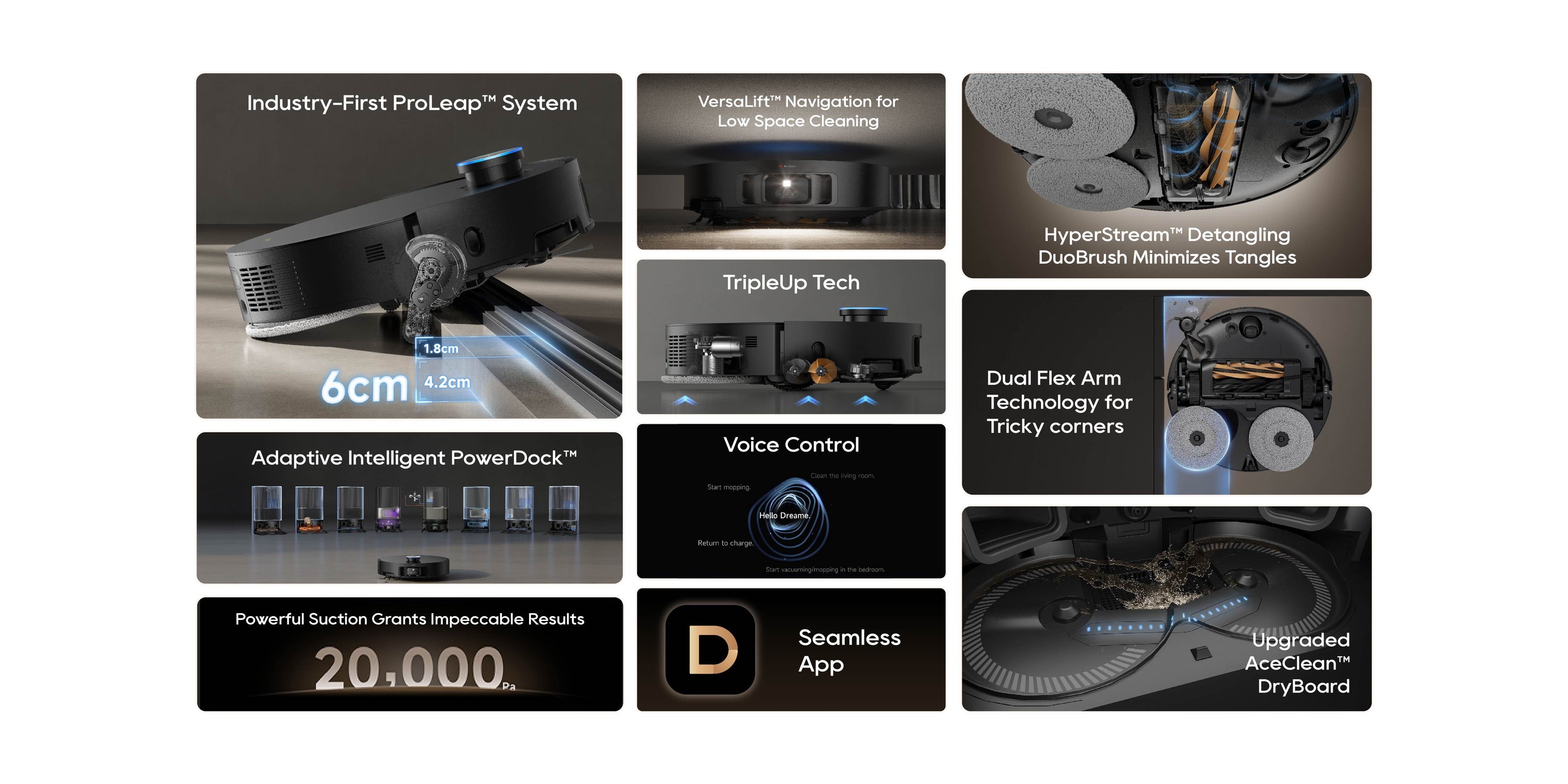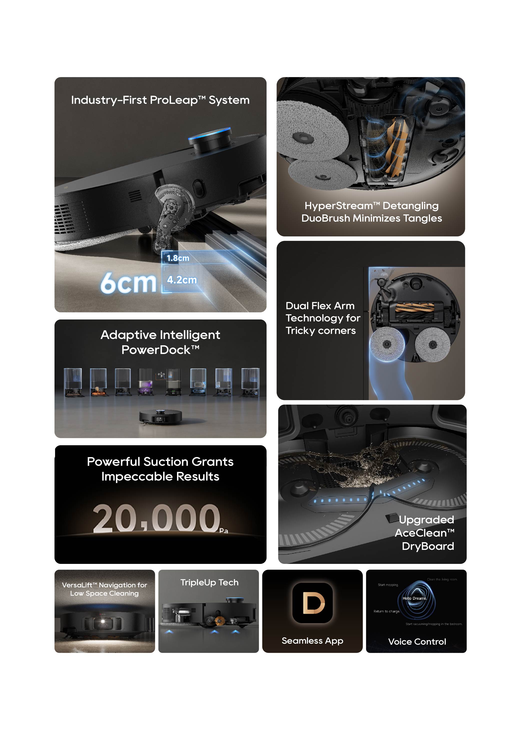 ProLeap⢠can overcome obstacles up to 6cm high, absorbing shocks for quiet cleaning. It lifts Retractable Legs to navigate door tracks, thresholds, and U-shaped furniture.