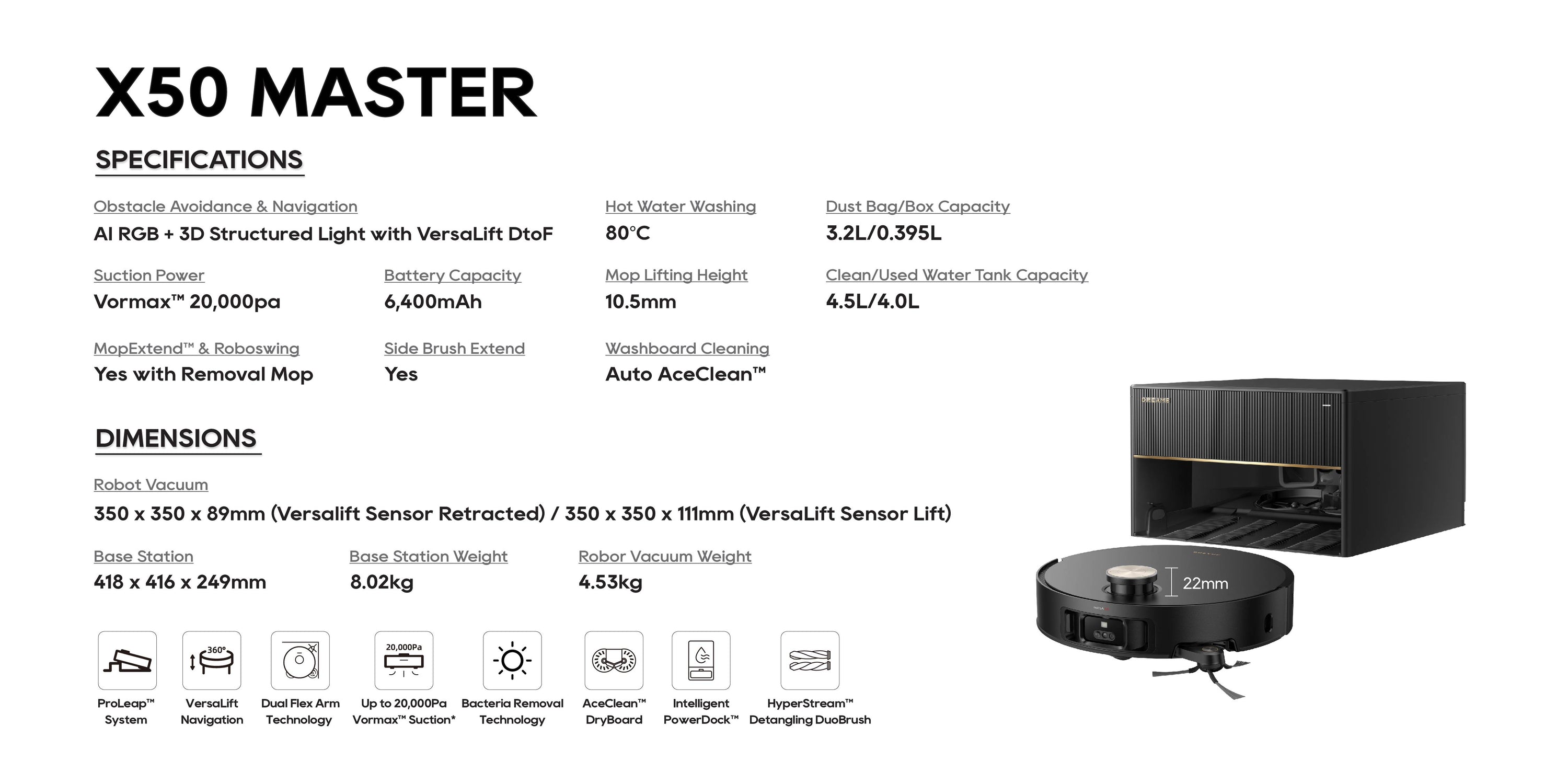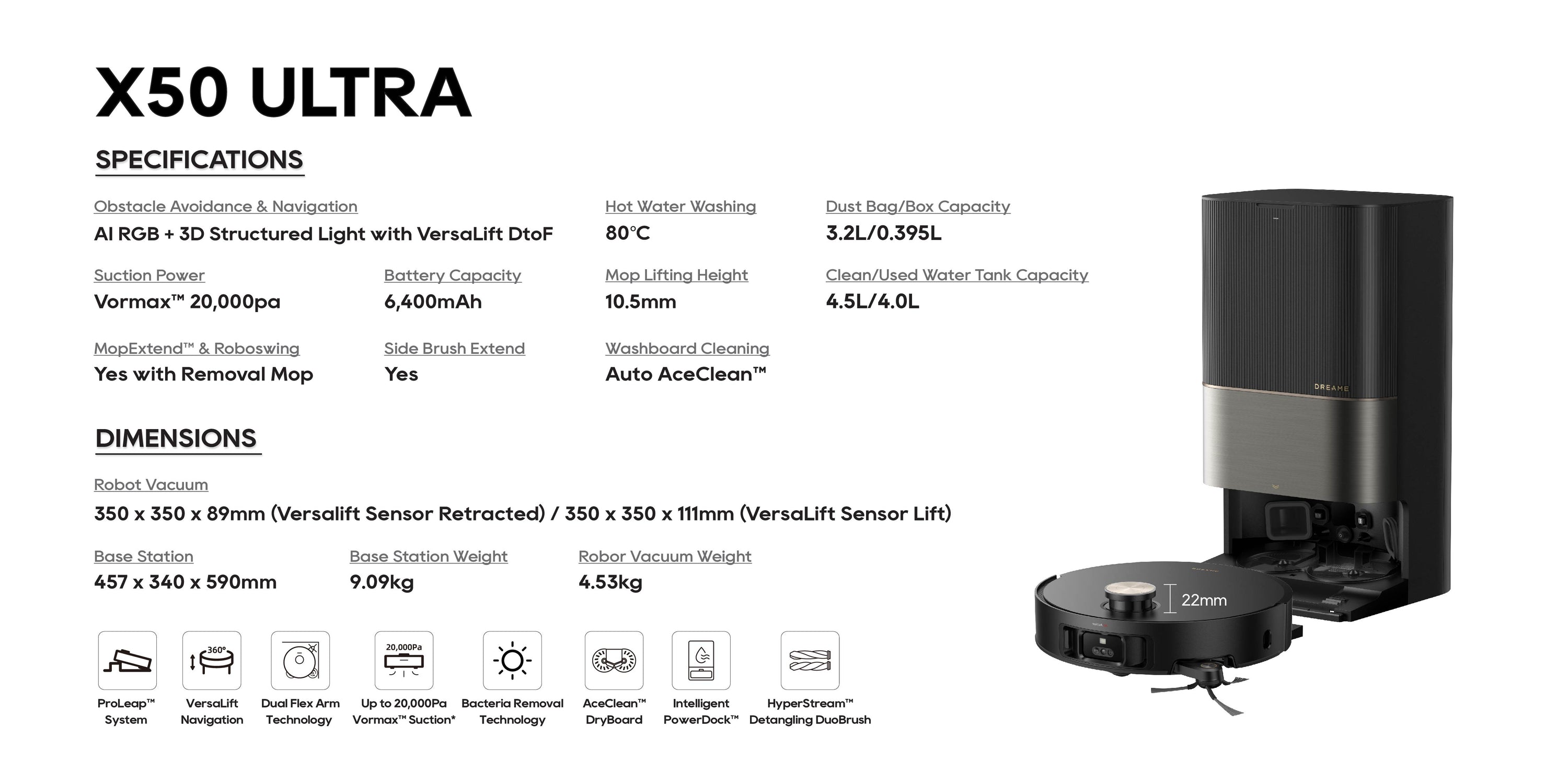 The retractable DToF sensor lowers X50 Ultra's height to 89mm, aiding in navigation under low furniture and cleaning narrow areas with an Al camera.