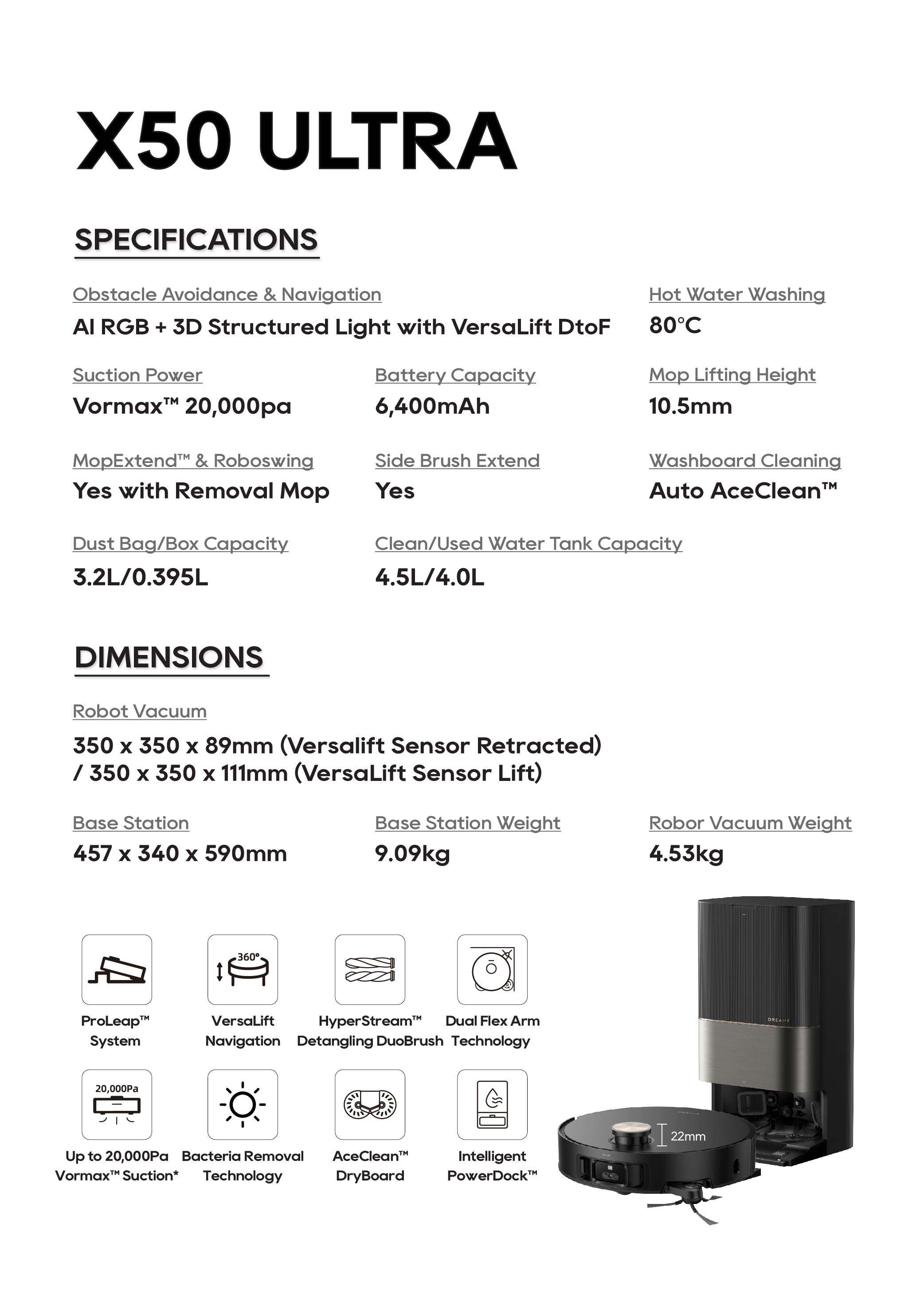 X50 Ultra's DToF system elevates its 360°* scanning sensor, creating a detailed, blind spot-free map for precise navigation without unnecessary spinning.