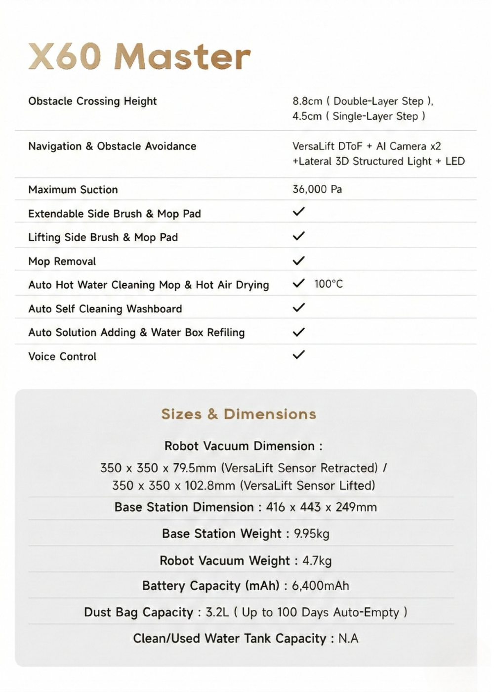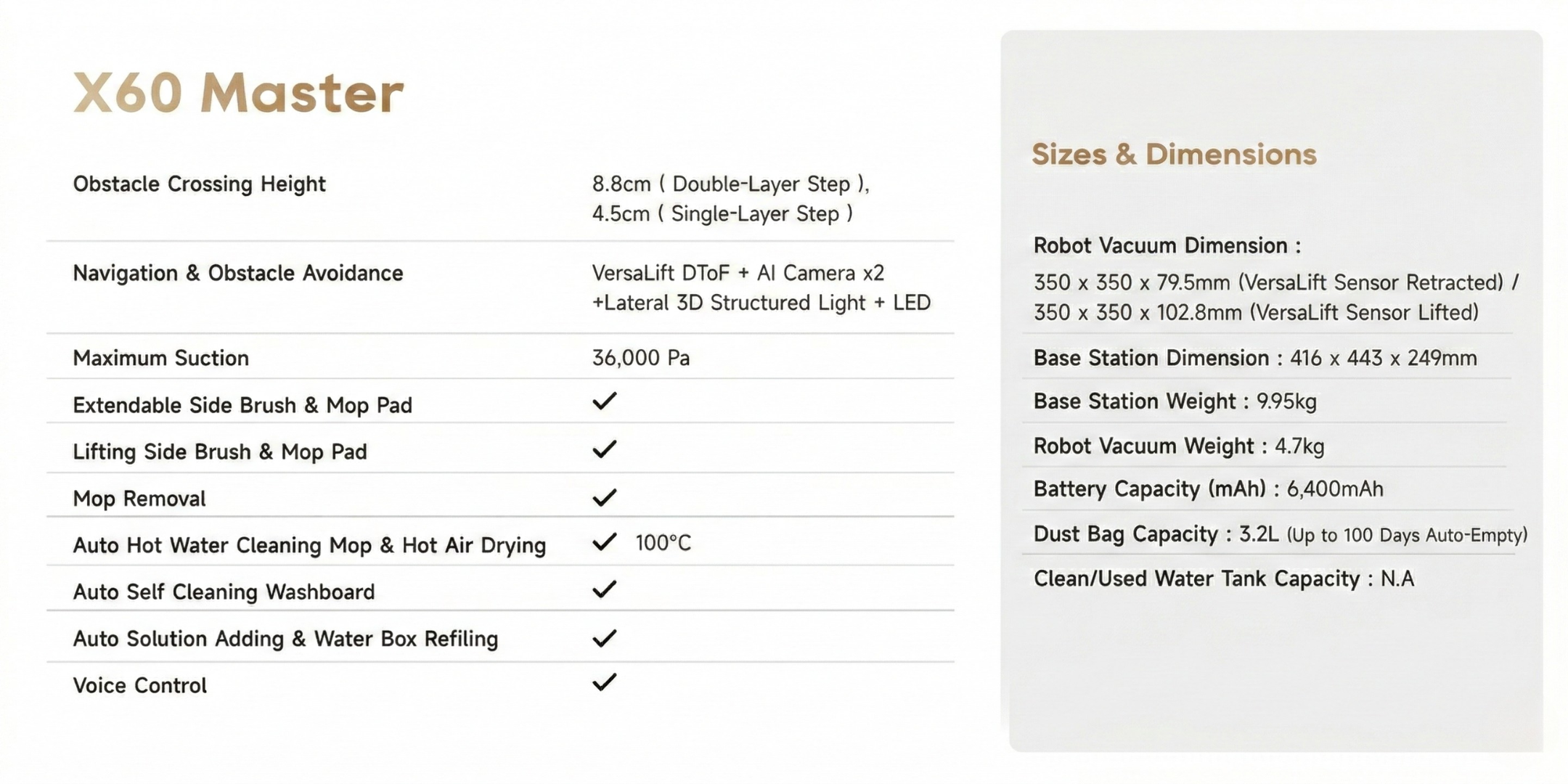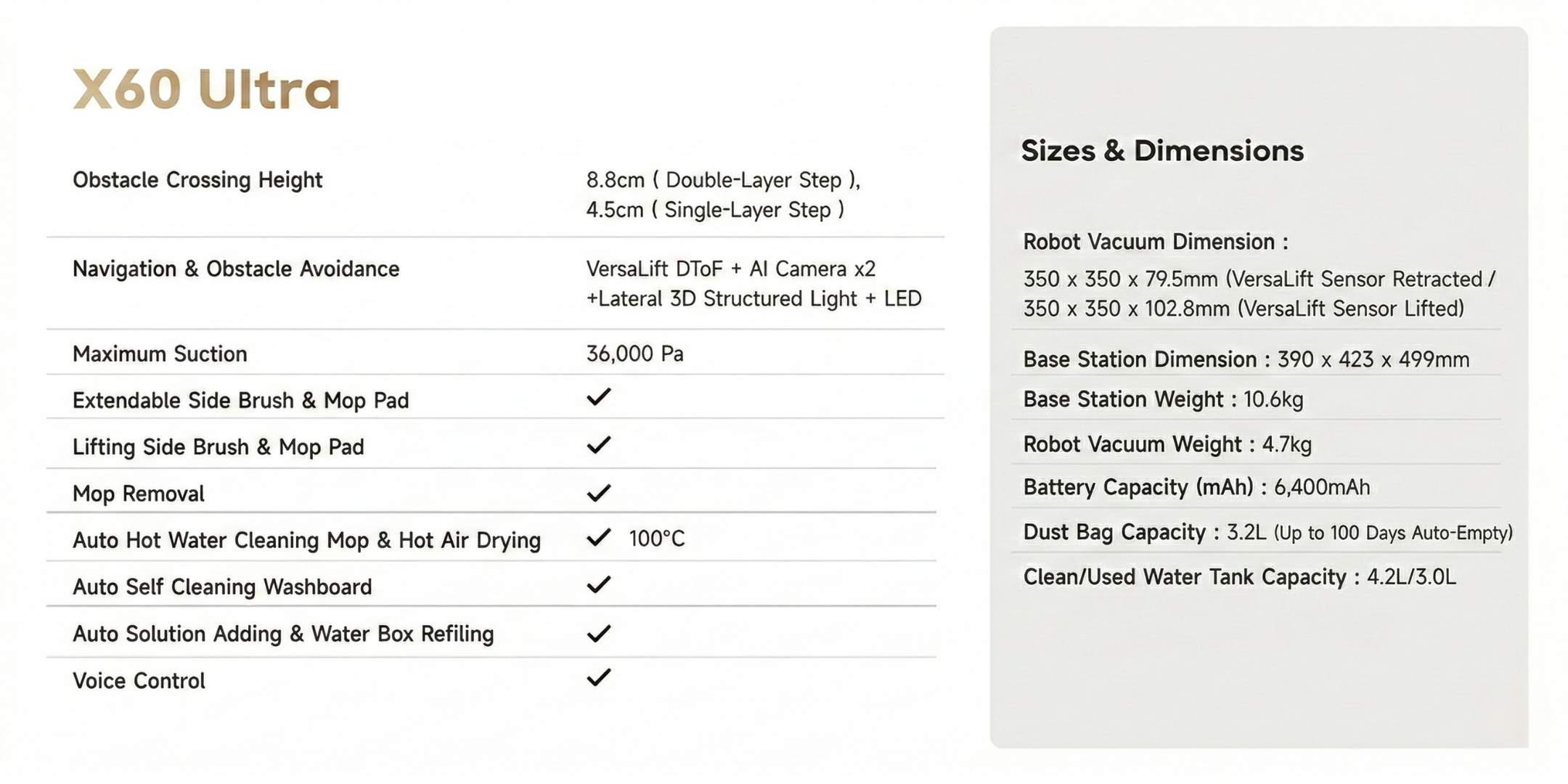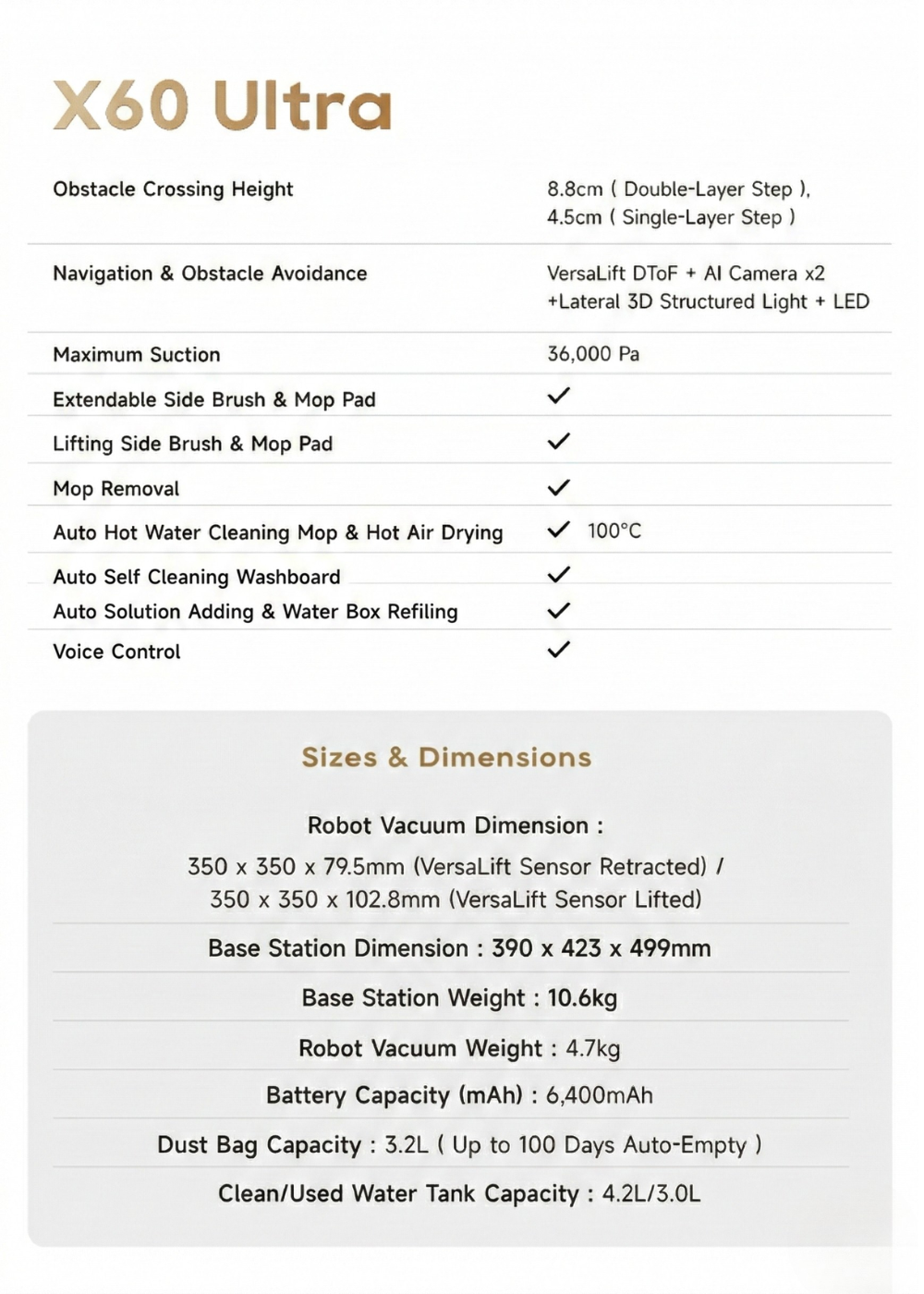 - Clean/Used Water Tank Capacity: 4.2L/3.0L (X60 Ultra)
